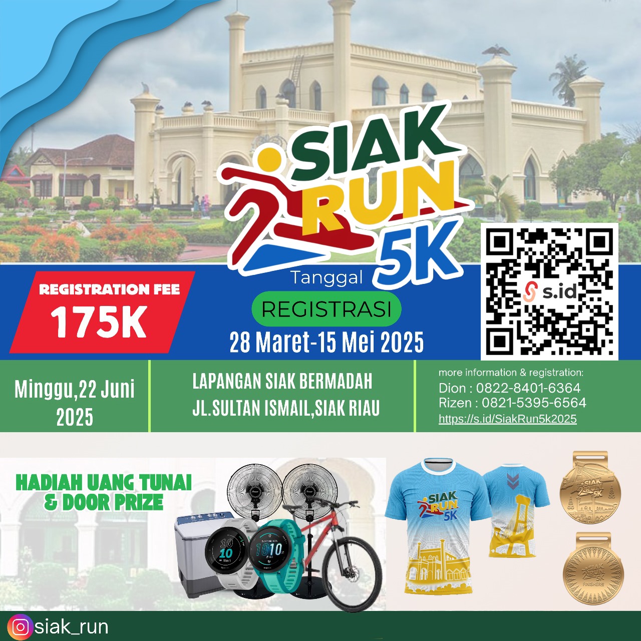 Mengikuti event ini cukup dengan membayar Rp175.000,- dan melakukan registrasi melalui link https://s.id/SiakRun5k2025 mulai tanggal 28 Maret s.d 15 Mei 2025. Peserta yang telah terdaftar akan mendapatkan racepack (jersey, bib, dan vitamin) yang dapat diambil pada tanggal 21 Juni 2025 di Panggung Siak Bermadah.