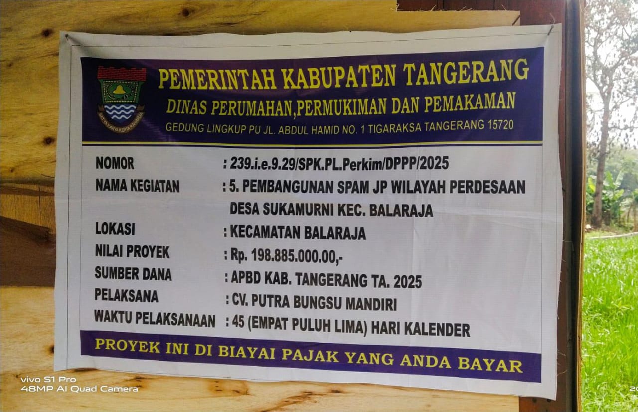 Proyek Pembangunan SPAM JP Wilayah Perdesaan Desa Sukamurni, Kecamatan Balaraja, Dengan Nomor: 239.i.e.9.29./SPK.PL.Perkim/DPPP/2025 Nama Kegiatan: 5 Pembangunan SPAM JP Wilayah Perdesaan Desa Sukamurni, Kecamatan Balaraja, yang menelan anggaran Rp 198,885.000.00,- Sumber Dana: APBD Kab, Tangerang, TA. 2025 yang dikerjakan CV. PUTRA BUNGSU MANDIRI Waktu Pelaksanaan: 45 (Empat Puluh Lima) Hari Kalender, yang di pertanggung jawab kan oleh Pihak Dinas Perumahan Pemukiman Dan Pemakaman (PERKIM) Kabupaten Tangerang,
