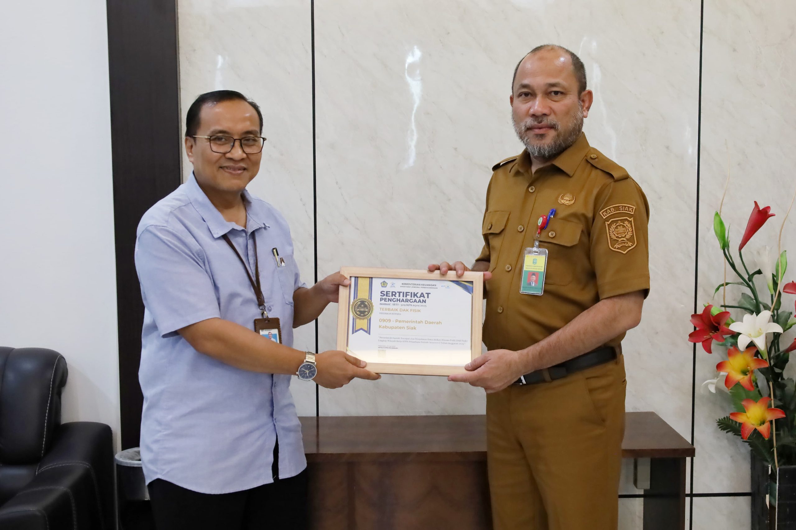 Piagam penghargaan tersebut, diserahkan oleh Kepala KPPN Pekanbaru Tri Widiyono kepada Kepala Badan Keuangan Daerah (BKD) Kabupaten Siak, Raja Indor di ruang Kerjanya Kantor BKD Siak, Komplek Kantor Bupati Tanjung, Selasa (14/10/2025).