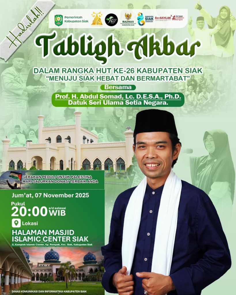 Pemerintah Kabupaten Siak mengundang seluruh masyarakat untuk hadir dalam kegiatan Tabligh Akbar dalam rangka Hari Ulang Tahun ke-26 Kabupaten Siak dengan tema “Menuju Siak Hebat dan Bermartabat”