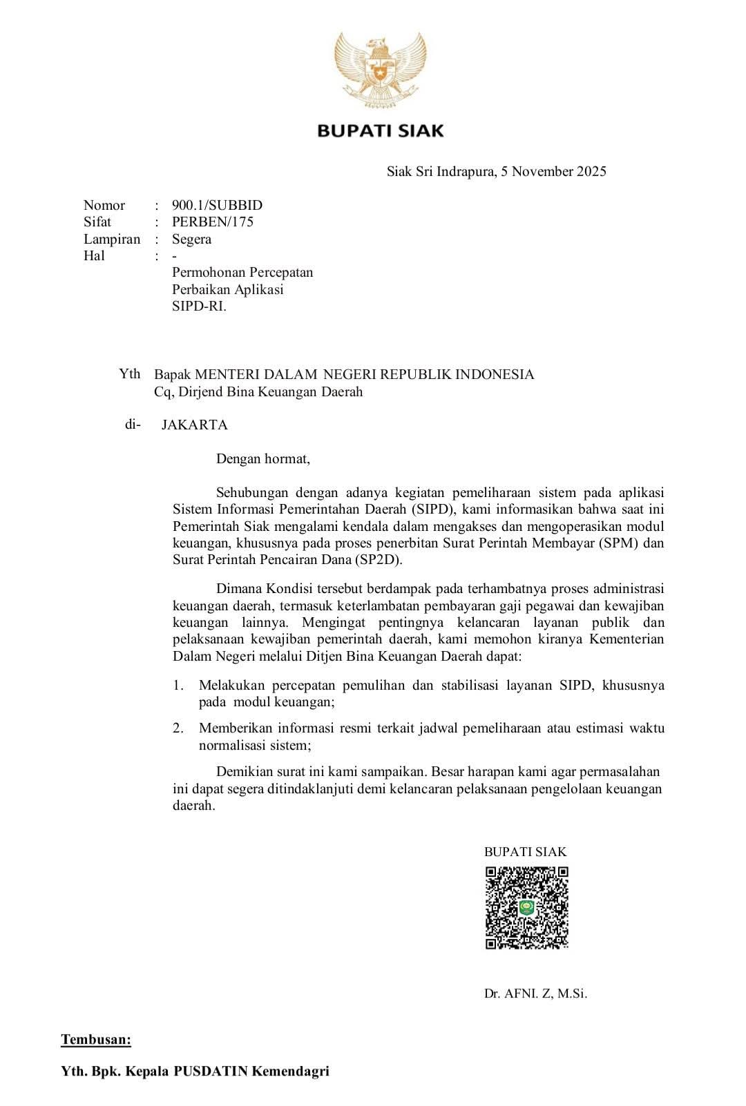 SIPD Kemendagri Alami Gangguan, Bupati Siak Bersurat ke Wamendagri